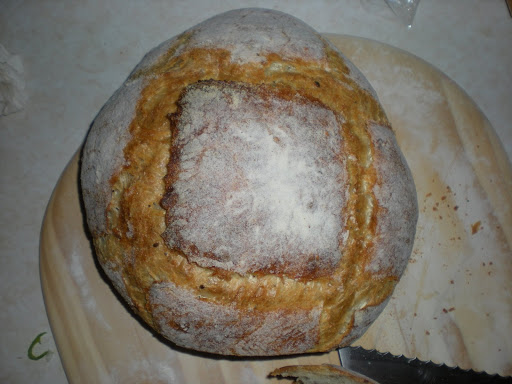 mix together, then cover with plastic wrap and a dish towel. Let rise overnight. After rising, punch down and shape. Put your dutch oven or pizza stone or ceramic tiles into the oven and preheat oven to 500 degrees. Put bread in the oven and turn the heat down to 470. Bake for thirty minutes, then take the dutch oven lid off. Bake 15-20 minutes more until golden brown and crusty looking. Let cool completely before slicing.