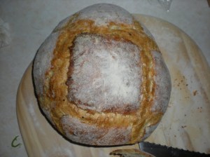 My favorite bread in the whole world is a very simple sourdough white/wheat mix. It’s just starter, flour, water, and salt. It’s based on Sullivan St.’s no-knead bread recipe, made famous by Mark Bittman of the New York Times. After making it a few times, I’ve tweaked the recipe to use less water. I also added starter instead of commercial instant yeast. The resulting loaf has a very complex, tangy flavor that makes things interesting.