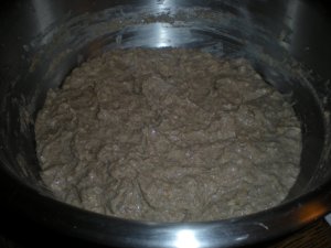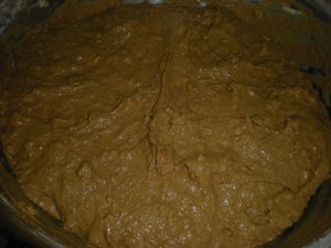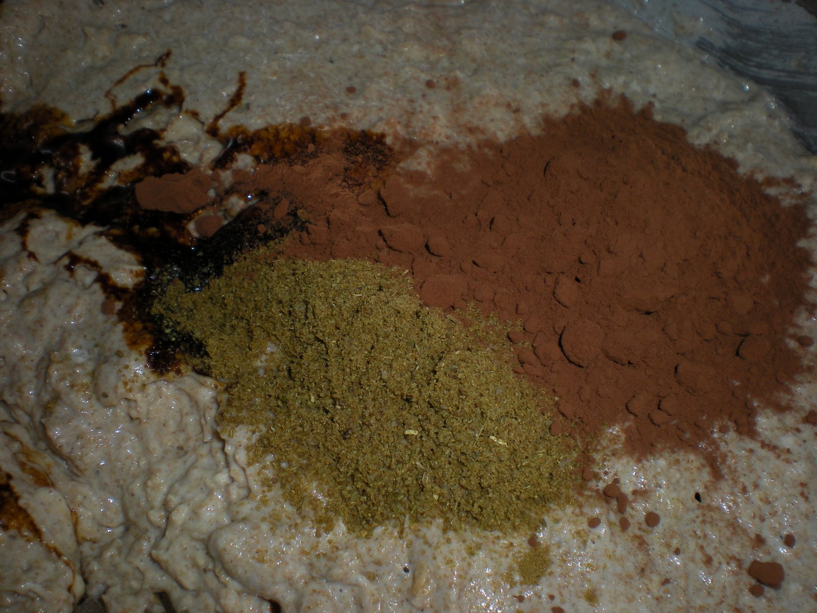 Next day, grind up the cumin and mix the spices with the flour. Add molasses, cocoa, coffee, and melted butter into the bowl from yesterday.