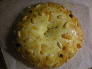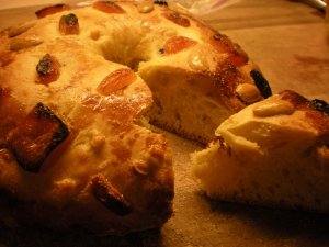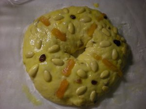 I don’t tend to use a lot of eggs in my bread. Any, in fact. Egg breads tend to be rich and sugary, and sugar isn’t something we eat a lot of here. But a grad school friend is having a birthday on Wednesday, so I decided to make a cake for her. And in the spirit of the holidays, I settled on Rosca de Reyes.
