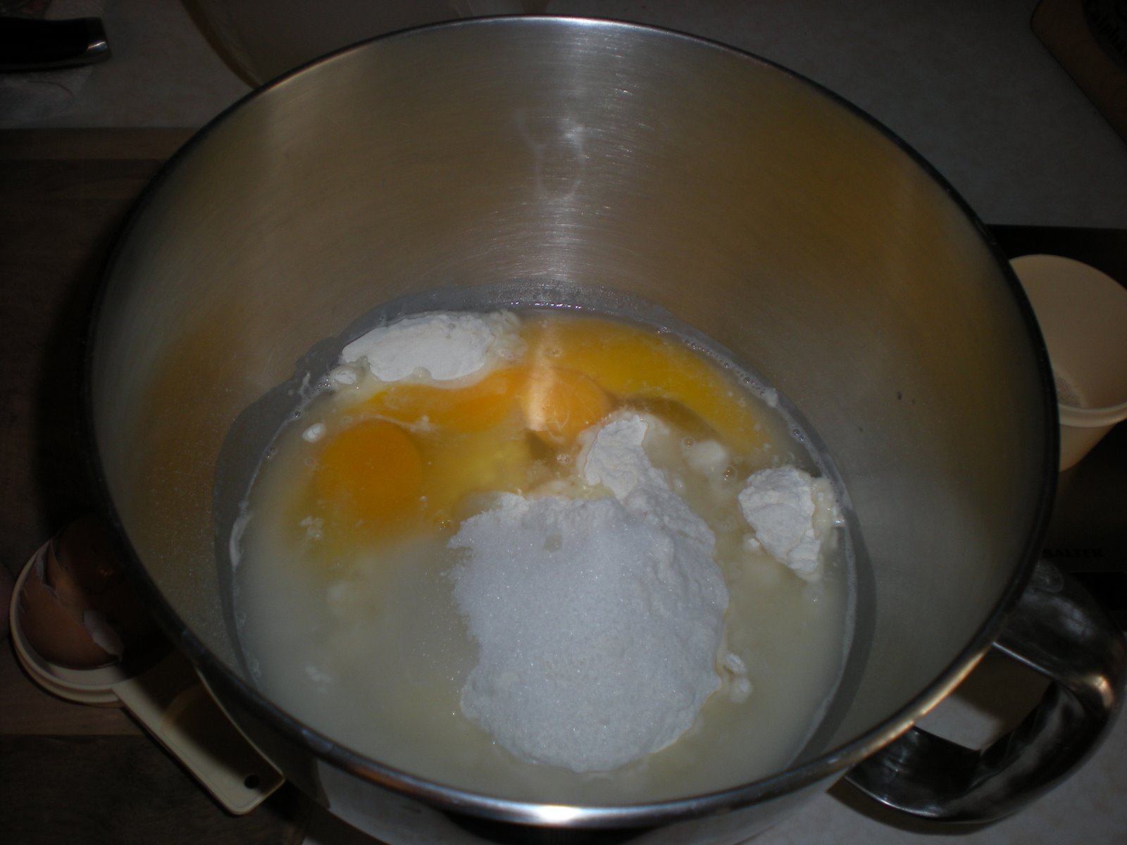 I had just enough eggs to make the recipe (13 eggs!) I mixed the first set of ingredients together (including three of the eggs) and set it out to rise.