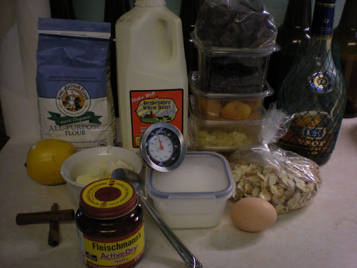 (From left to right: lemon, cinnamon, flour, lard/butter, yeast, milk, sugar, egg, dried fruit, almonds, brandy)