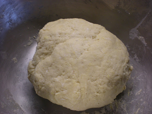 5. When the sponge is ready (don’t throw away the plastic wrap!), combine the remaining flour, salt, sugar and cinnamon in a large bowl. Add the sponge, egg, softened butter, and a few tablespoons of the water. You want to form a soft but not sticky dough. Also, since you are going to be adding the brandy soon, it’s better if it’s slightly dry.
