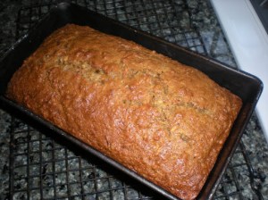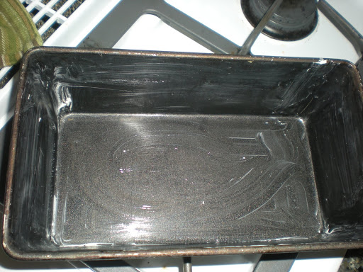 Now pour into a greased bread pan and pop in a 350 degree oven for about an hour.