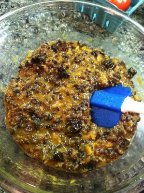 Up to 5 days before you make the cake, chop up all the fruits for the fruit base. Place in a large bowl, pour in Angostura bitters, cherry brandy and rum (I use Bailey’s when I have extra $$$ and it really makes it extra special 🙂 ). Leave in a cool corner, covered, to soak up the liquor. As I said 3-5 days before is the best option, 24 hours minimum if you must be ’so last-minute’!