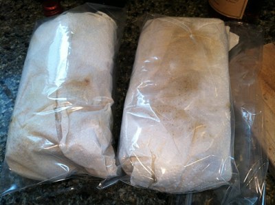 10. After they are cool, pour a good jigger of rum over the top of each cake and store in a plastic zip-top bag.  The alcohol acts as a preservative, so pour on!  The cake really absorbs a lot of liquid, so don’t be stingy.