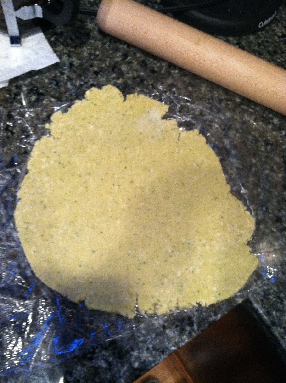 7. Take your dough out of the refrigerator and remove the plastic wrap. Using a rolling pin, gently roll the dough out. You don’t need to roll it thin; you will use your fingers to spread the dough into the pie pan.
