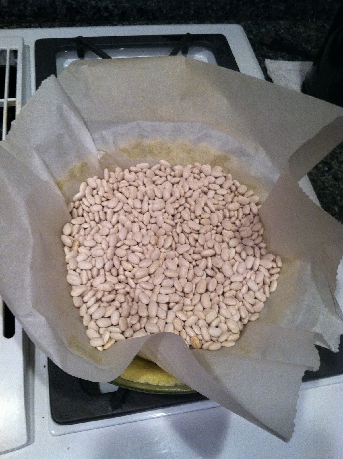 10. Bake the crust for about 7 minutes, then turn the oven off, remove the parchment and beans, and let the crust sit in the oven to dry out until you are ready to fill it.