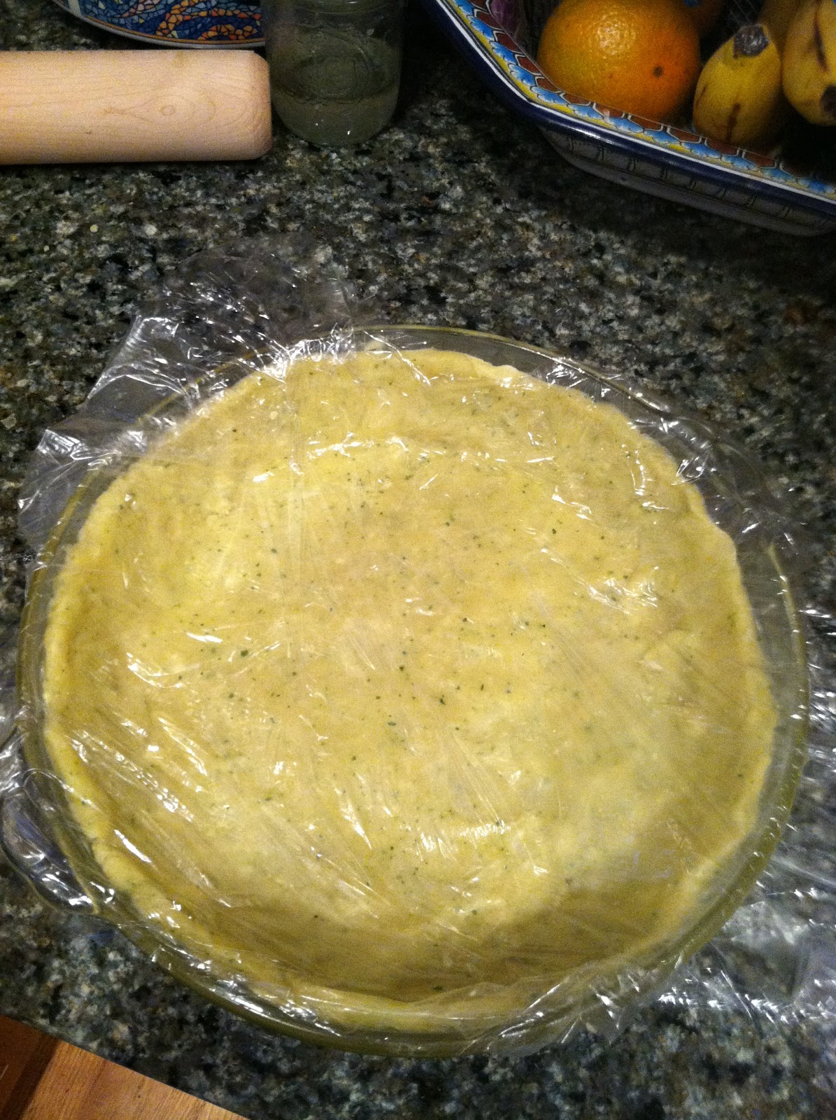 8. Gently move the dough to a greased glass pie pan. Using your fingers, push the dough out and up the sides of the pan. Cut off any overhanging pieces. Cover with plastic wrap and refrigerate while you preheat the oven to 435 degrees F.
