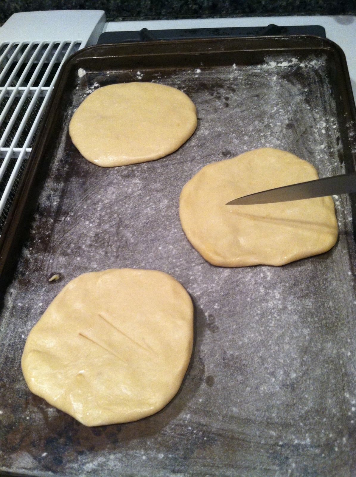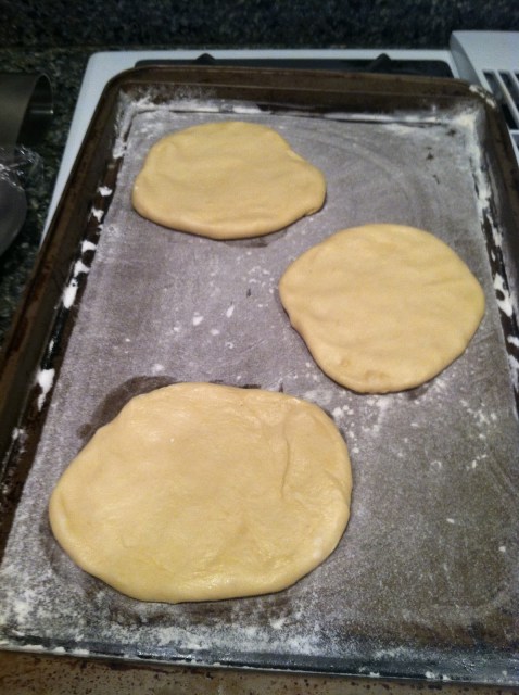 8. With your fingers, stretch each ball of dough into a flat circle. Place them on the parchment or floured baking sheets. Cover them with plastic wrap and let them rest while you preheat the oven to 425 degrees F.