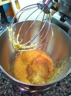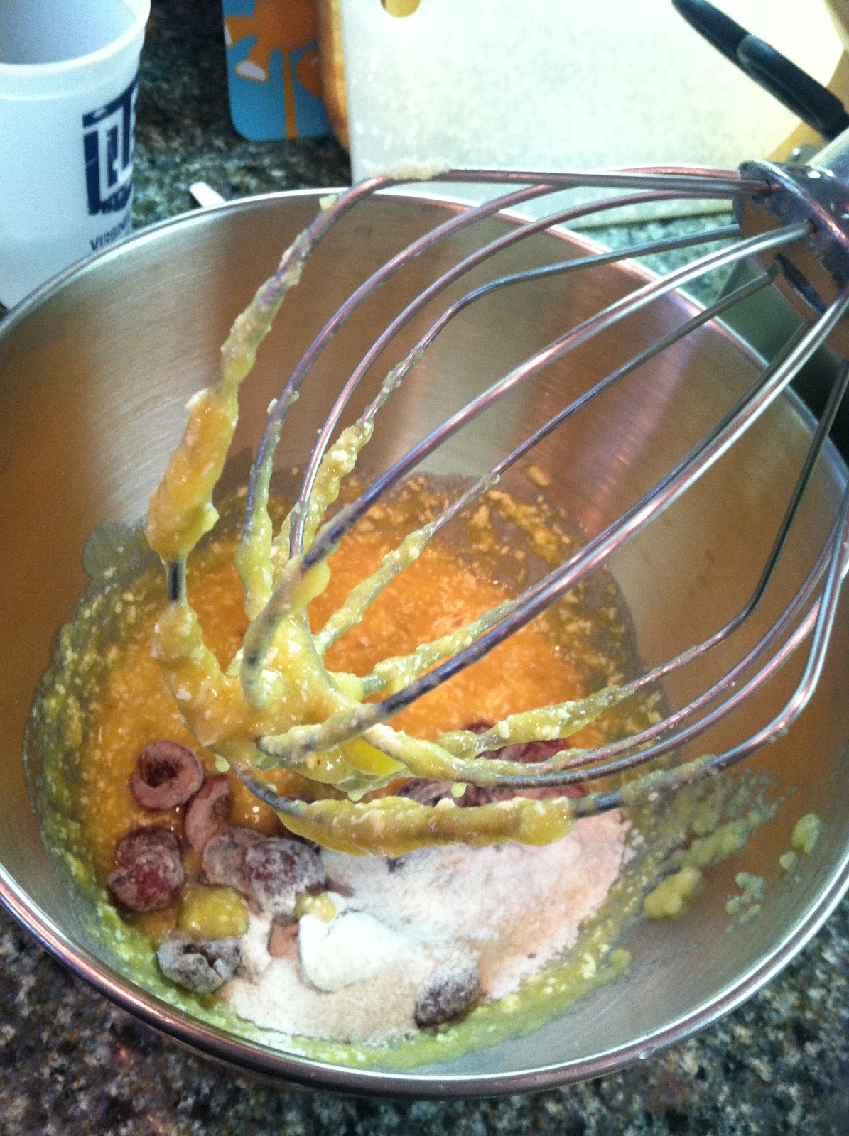 5. Add the flour mixture to the banana mixture, 1/2 cup at a time, mixing after each addition until moistened. Add the oats and cherries right about now as well.