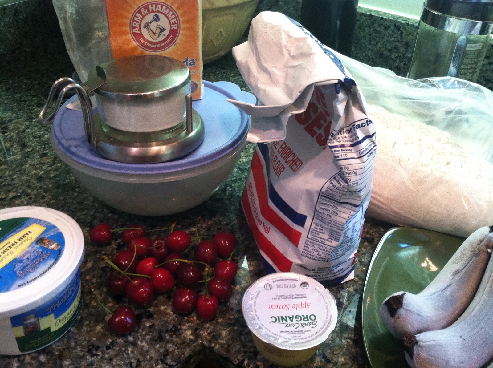 Anyway, last Saturday I bought a ton of fresh cherries. I had been thinking about what to do with some past-their-prime bananas, and I had the idea of making banana bread, and throwing in some cherries just to spruce it up a little.