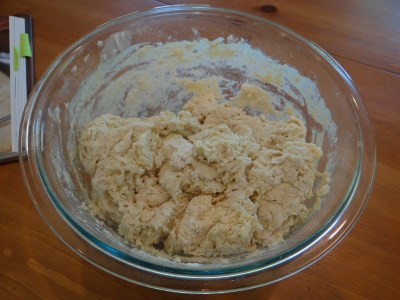 4. Using a large spoon, mix to combine the ingredients. When you can’t easily use the spoon anymore, ditch it and mix with your hands instead (make sure they are clean). Use a folding technique where you scoop one side from underneath and fold it over the top of the dough. Almost like you’re folding a shirt or something.