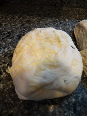 8. Peter Reinhart’s recipe just calls for you to roll up the loaf so the cheese is a spiral, but I wanted the cheese to be more evenly distributed so once I rolled it up, I folded it a couple of times, let it rest, then folded a couple more times.