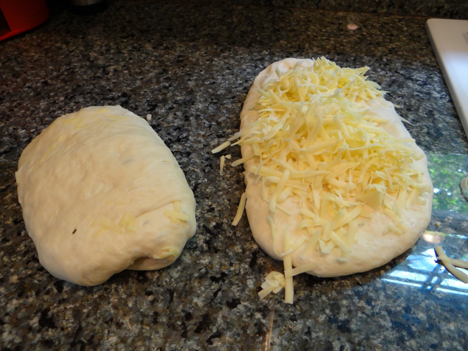 7. Lightly flour your work surface. Take the dough out of the bowl, punch it down gently, and divide it into two loaves. Flatten the loaves out with your hand, then spread half the grated cheese on top of each loaf.