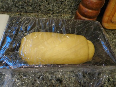 5. Grease a bread pan with butter. Punch down the challah down, roll up into a long roll and cinch the end. Transfer to the bread pan, cover and let rest another hour.