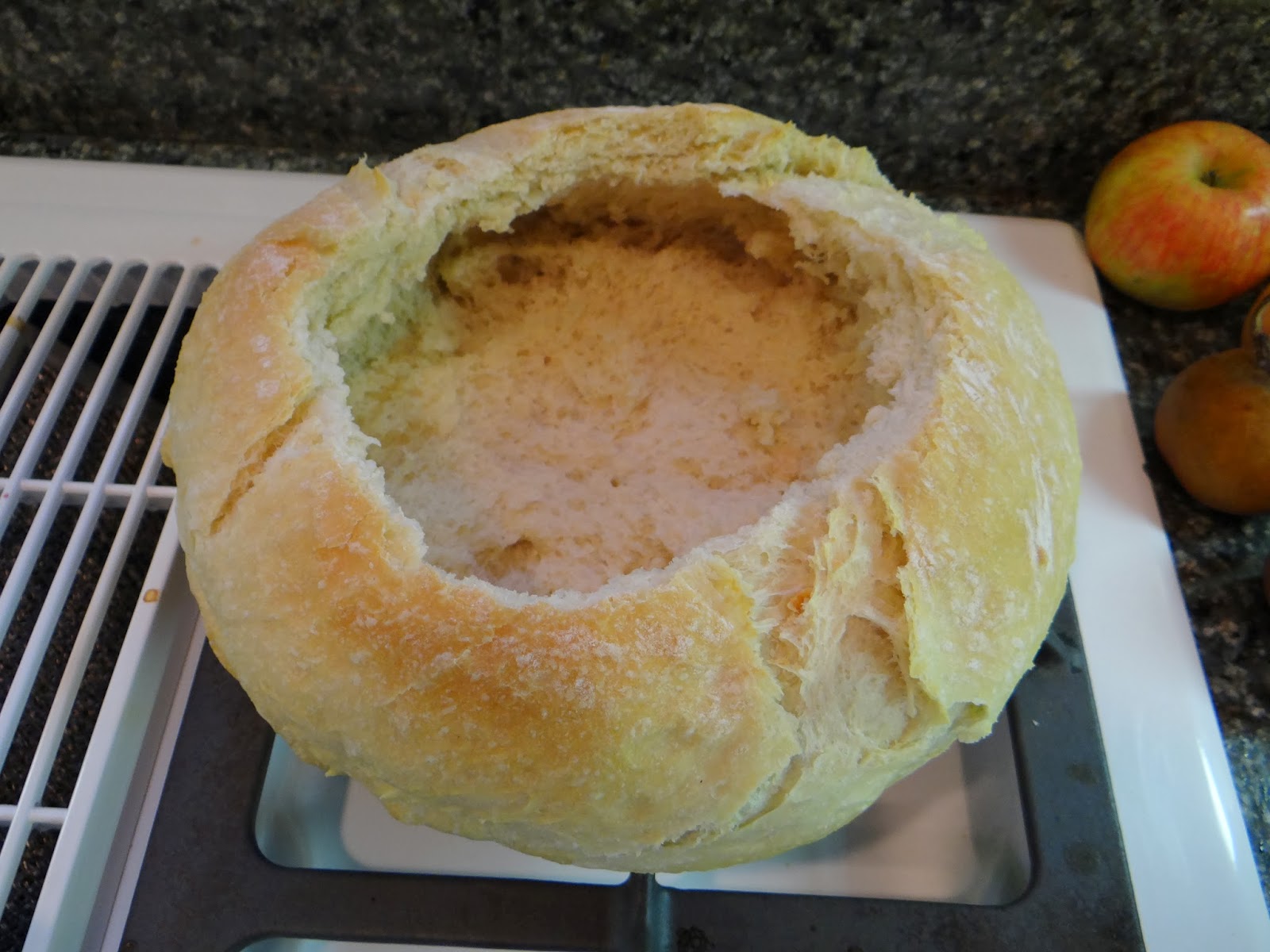 Let the loaf cool completely, then use a sharp knife to cut a circle around the top and remove it. Use your hands to pull out the rest, working around the sides and the bottom to make it even. Once you hollow it out, it will look like this: