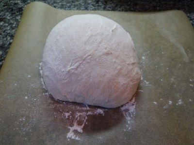 After it has risen once, punch it down and transfer it to a piece of parchment paper and cover it with plastic wrap. Throw your dutch oven into the oven and preheat it to 450 degrees F.