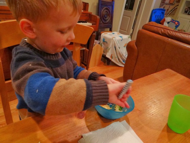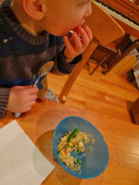 Little Bread Toddler saw it in the skillet and said, “I want something else,” then proceeded to eat four bowls of the stuff. Again, he’s a messy eater.