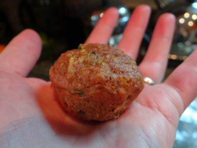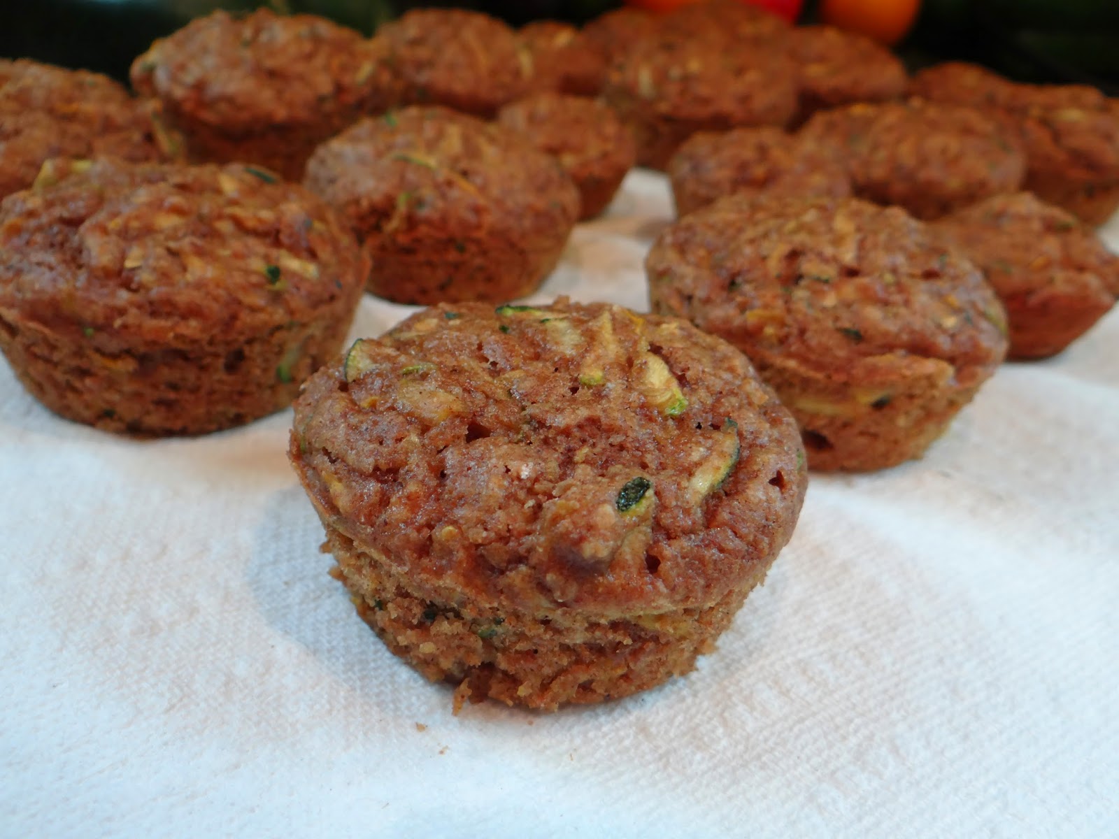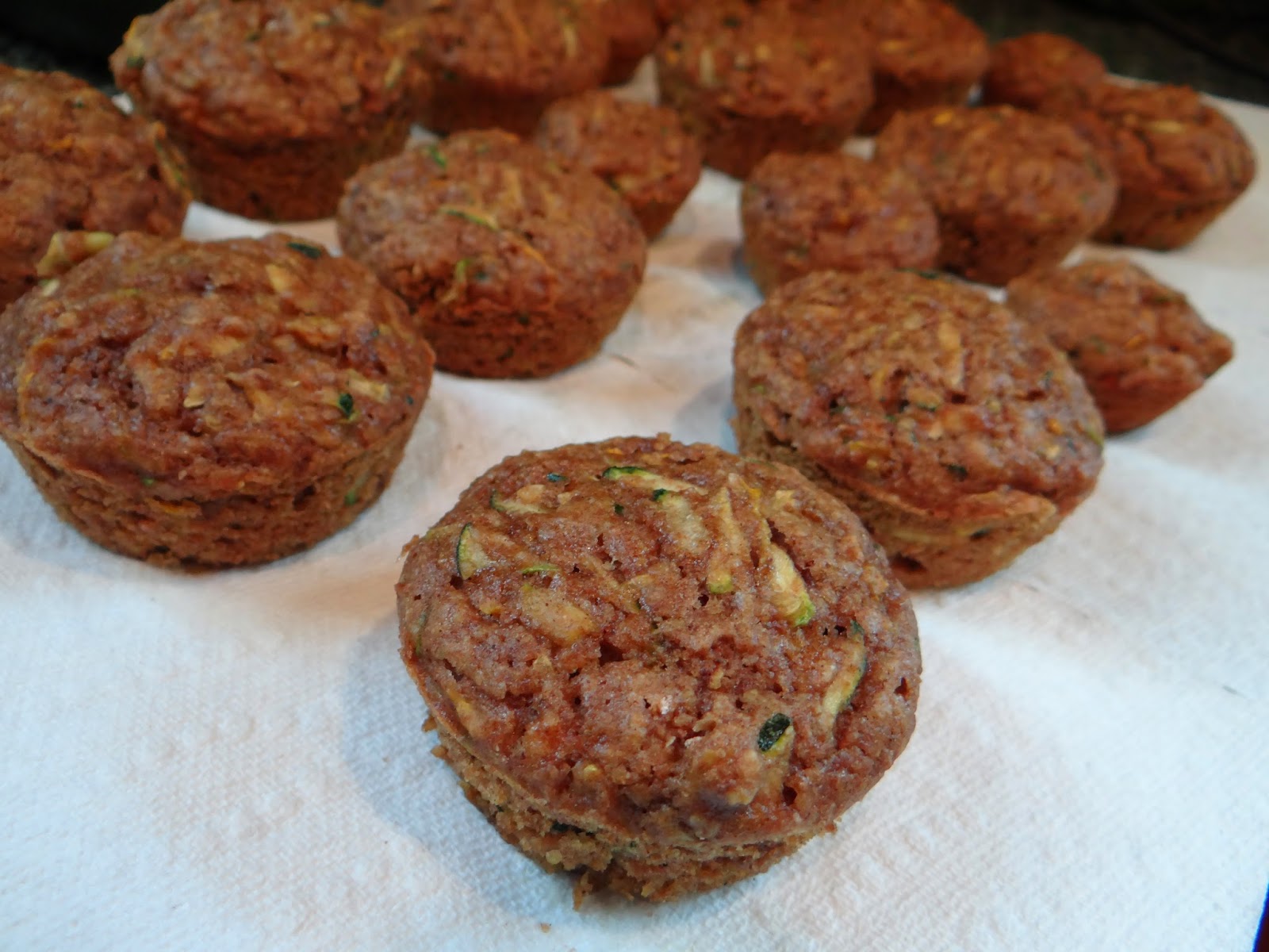 This is a great recipe for using up squash. You use 2 zucchini (or summer squash) for 12 regular-size muffins and 12 mini muffins, or 18 regular-size muffins. I like the mini muffins because they are so cute and you can just pop them in your mouth.