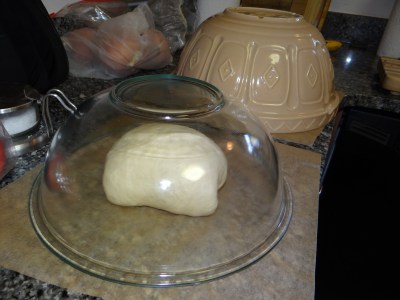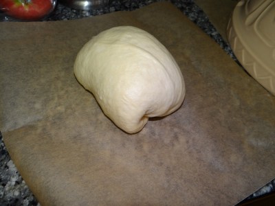 5. Once the dough has doubled, punch it down and divide it into two equal parts. This is more important if you plan to use loaf pans; if you are baking both loaves at the same time they need to be exactly the same size or they won’t bake evenly. Weigh out the dough after punching it down and then divide into two equal halves. If you are making boules, you can just eyeball the two halves. Shape the loaves as you wish. If you want to use the dough to make sandwich bread, flatten it out and then roll it up and place it for the second rise into two buttered bread pans. If you want boules, shape the loaves into balls and place for the second rise onto sheets of parchment paper and cover each loaf with a large bowl to form a dome.