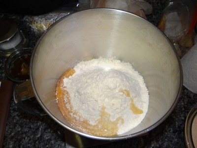 2. In a large mixing bowl or the bowl of your stand mixer, combine the flour, salt, egg, honey and bacon drippings and set aside until your yeast mixture is ready. Then add the yeast and milk into the mixing bowl.
