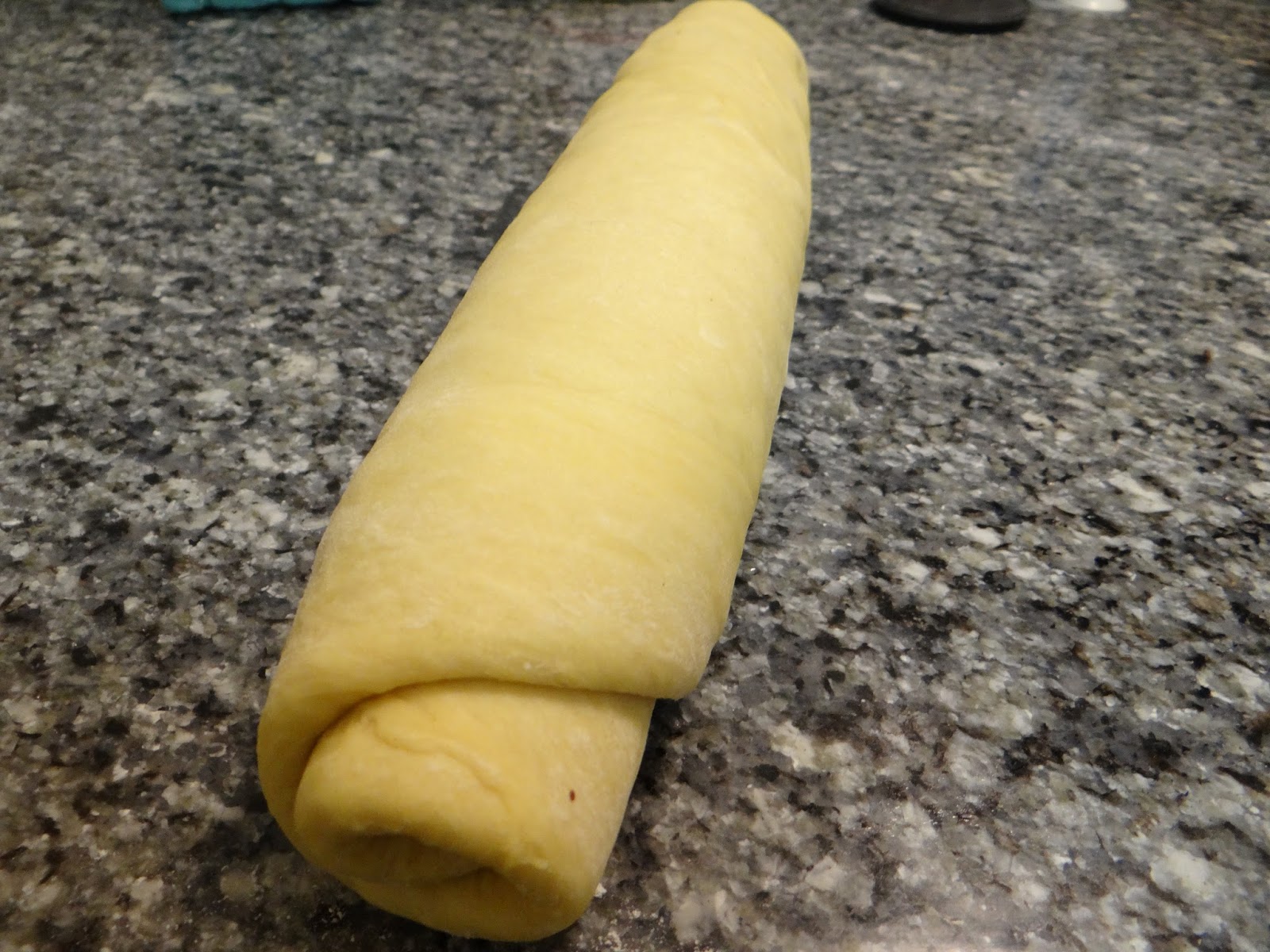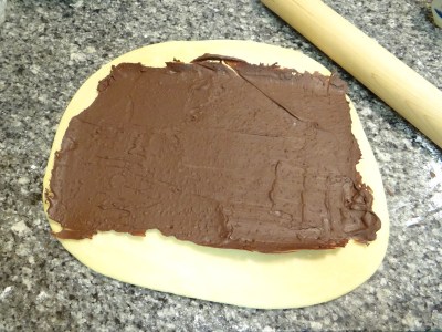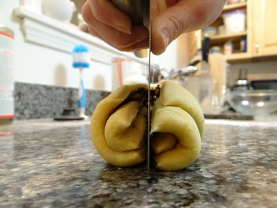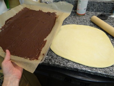 Roll one half into a large rectangle, then spread the filling into a thin film on the dough. Carefully roll the dough up, then cut it straight down the middle using a pastry scraper.