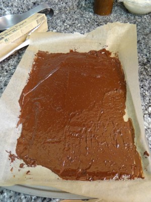 Peter Reinhart says to spread the chocolate onto a piece of parchment paper on a baking sheet, then refrigerate the chocolate until it is firm. But Deb Perelman doesn’t have you refrigerate the chocolate, and I think next time I’ll skip that step. I think it would roll easier if it were melted.