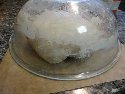 5. Shape your dough into a tight ball and place on a sheet of parchment paper. Flip your mixing bowl over to create a dome. Let rise about 30-45 minutes. Preheat your oven to 500 degrees F with your dutch oven inside.