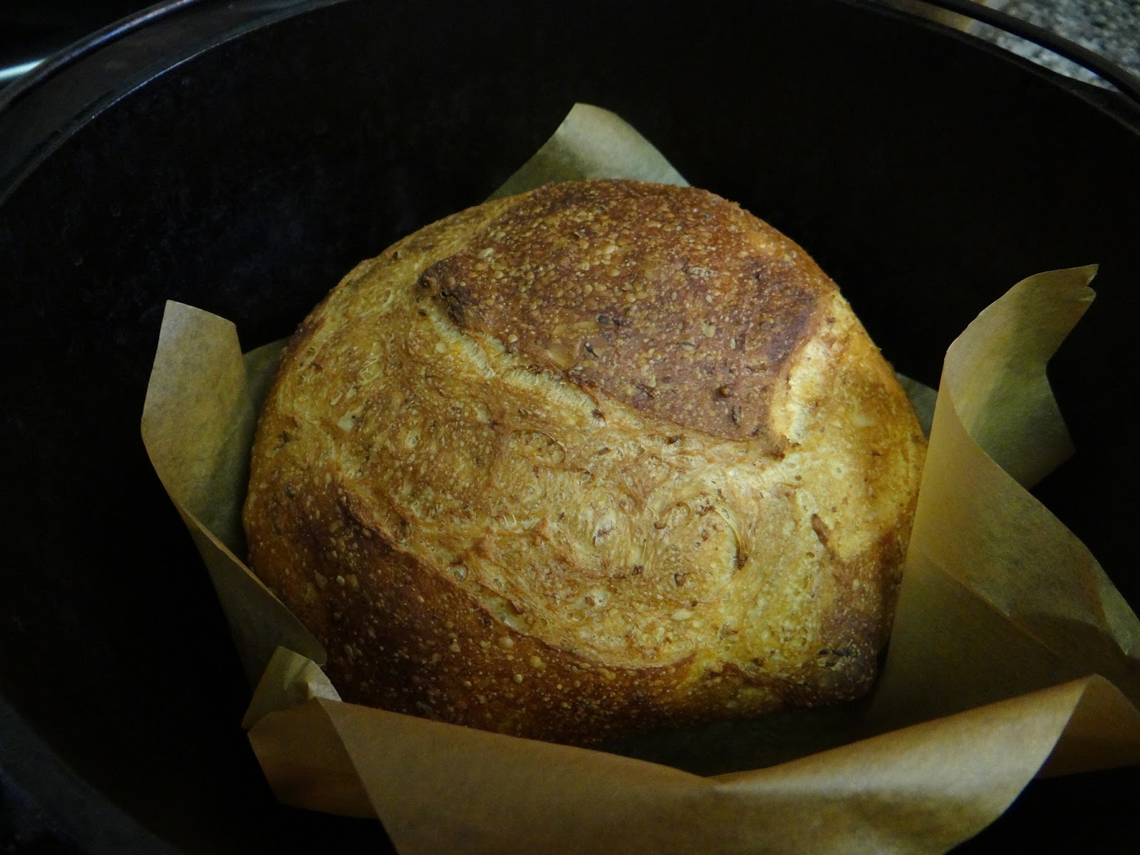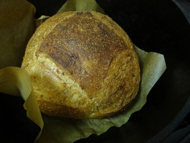 6. When the oven is preheated, use a sharp knife or razor blade to score the top of your dough. Put in the dutch oven and cover with the lid. Bake about 25 minutes.