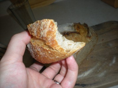 If you baked your bread in a very hot oven, the bread will cool rapidly once it is taken out and the crust will start to contract as it cools. The hard crust will crack as it contracts, and some of the water just under the crust will escape through the cracks as steam. About 2-3% of the weight of your loaf will be lost due to moisture loss during cooling. I like the imagery of the bread crackling as “singing.” I even tried to record a video once when a loaf was singing quite loudly.
