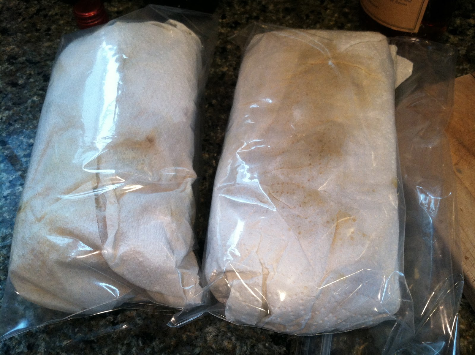 Option #1: Store on the counter, don’t pre-slice it and eat it quickly. My bread stays soft, but starts growing mold after a week on the counter in a plastic bag. However, if I store it in a paper bag it doesn’t mold but gets hard and dry. If you are likely to finish your bread before the week is out, I would store it on the counter in a plastic or paper bag (pick your poison: quicker molding or tougher bread). If you have a super crusty crust on your bread and want to avoid plastic bags, once you slice it, place it cut side down on your counter. That way, the crust will prevent some of the water from wicking away. You can’t do this with breads that have a soft crust though. By keeping the loaf whole instead of pre-slicing it, you also delay some molding from occurring because it limits the surface area where mold from the air can settle, and the crust is less porous than the interior so mold doesn’t spread as easily.
