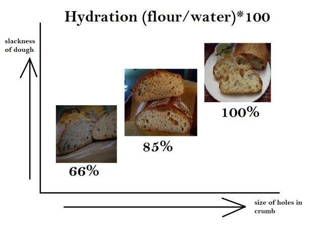 1. Hydration – Ratio of flour to water measured by weight; ranges from sandwich breads at 66% to french baguettes at 85% to quick breads at 100%.