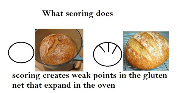 6. Scoring – Not only makes your dough pretty but provides weak points in the surface for the bread to expand; particularly important for doughs baked at high temperature (425 degrees F and up).