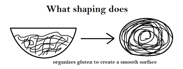 5. Shaping – Not only makes your dough pretty but stretches and organizes your gluten net more uniformly; provides smooth surface for scoring later.