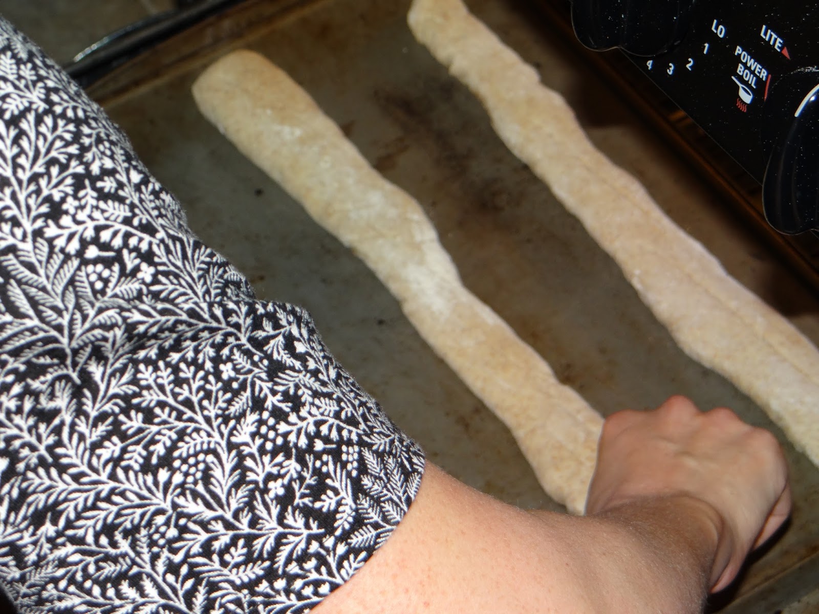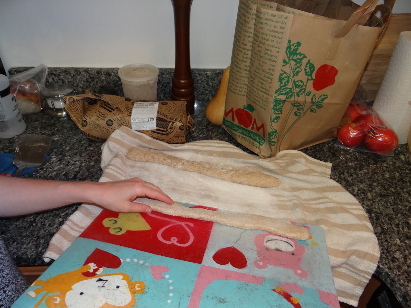 After I refrigerated it overnight, I took the bowl out the next morning and let it rise on the counter for another four hours. Then I divided the dough into eight pieces, rolled them out into baguettes, then let them rise another hour in my floured towel couche.