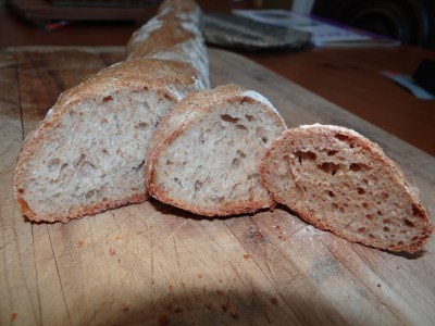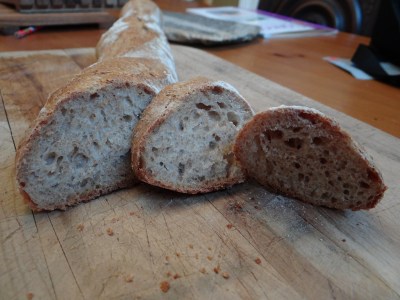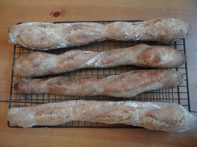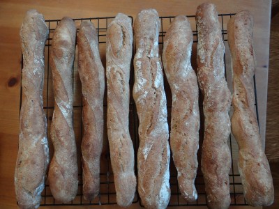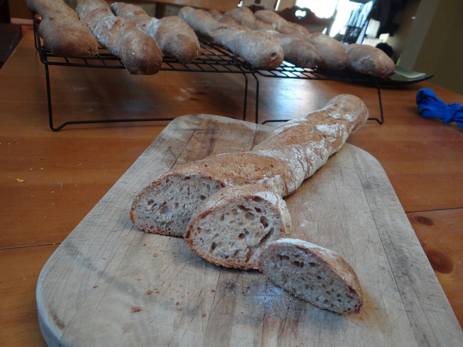 I was hosting the after-church fellowship hour, so I cut these up and brought them with my soup. Even without salt, they got rave reviews. The whole wheat ended up being a benefit because they didn’t go stale as fast as regular white flour baguettes.