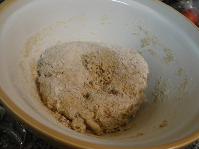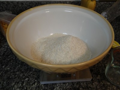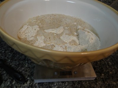 Mistake #1: Wrong flour. This wasn’t really a mistake so much as a failure to plan. I ran out of all-purpose flour at 400 grams, and had to substitute whole wheat for the other 800 grams. Not the worst problem ever, but it does affect gluten formation. Whole wheat flour has less protein content than AP flour and absorbs more water. I added 800 grams of water (instead of the usual 775g) initially, then another 1/2 cup with the yeast, sugar and honey mixture.