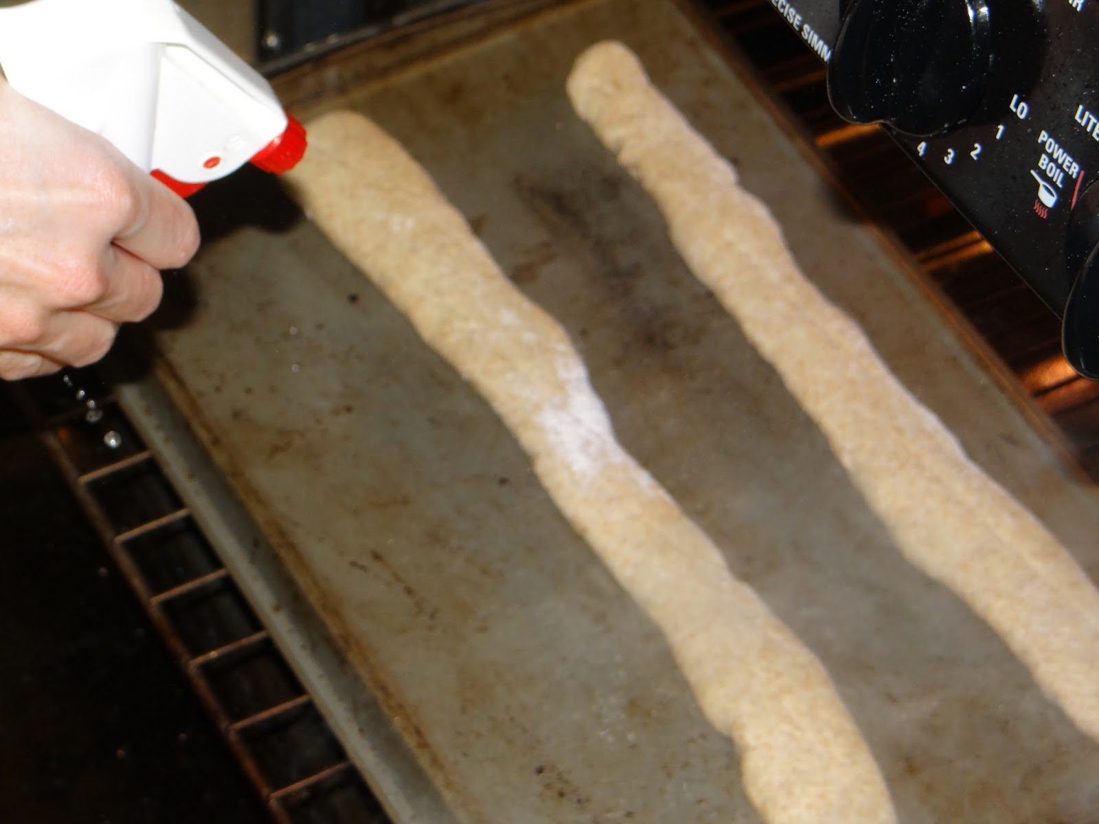 Spraying the baguettes after scoring them. This picture is blurry because the sprayer created lots of steam!
