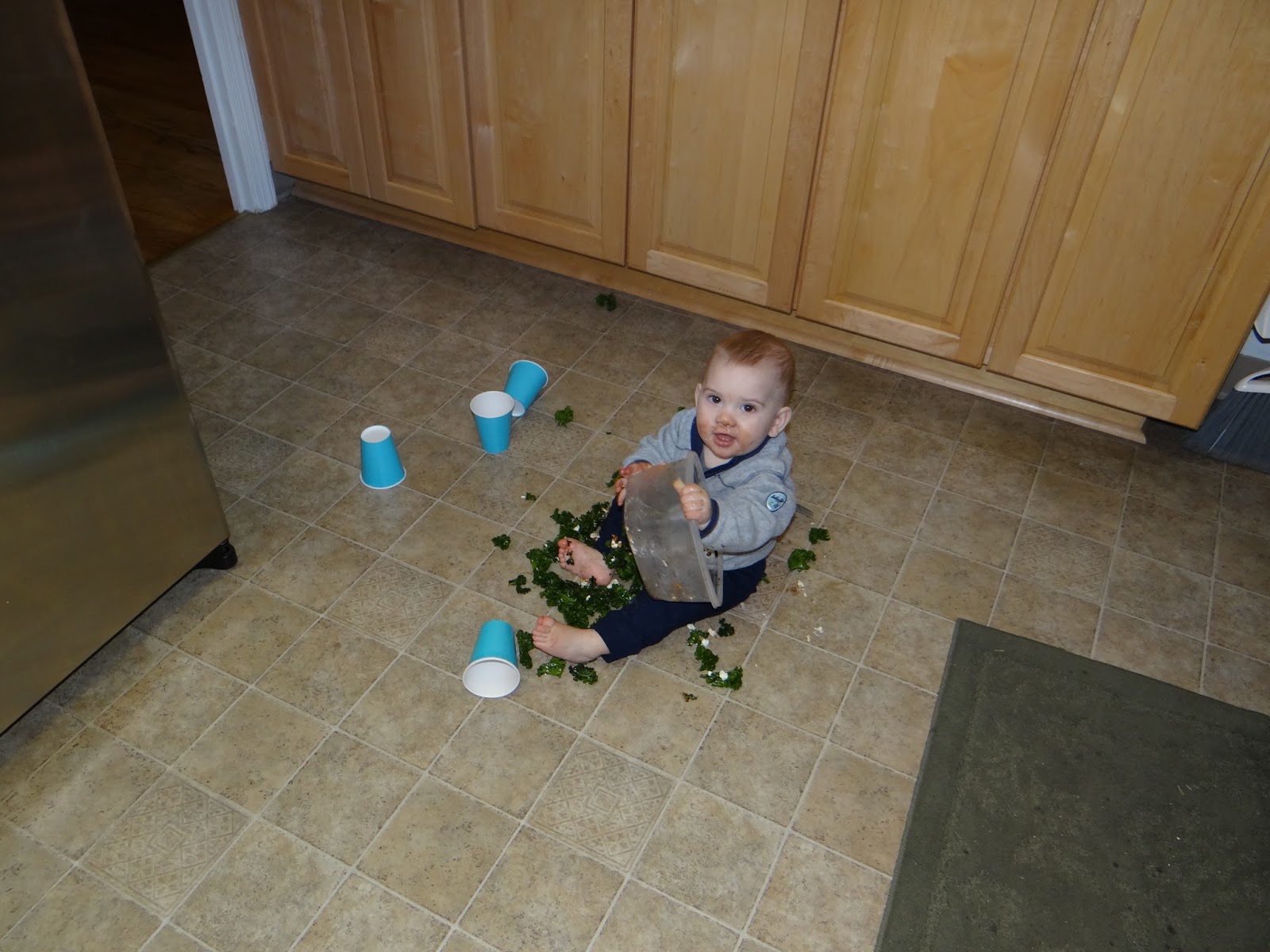 I LOVE a happy ending! And little bread dude #1 is becoming more and more independent … which is as it should be, but at times may not be much fun. I like reading about his appetite for adventures in the kitchen. And nice picture of little bread dude #2 wearing that kale salad!