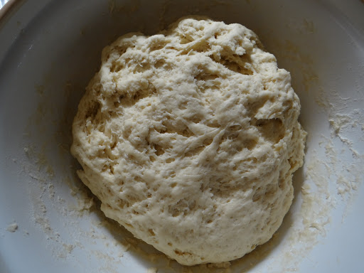 Oh no, I forgot the oil (pours it on the dough and kneads it in). Oops, it was just supposed to grease the proofing bowl. What is going on with me today?