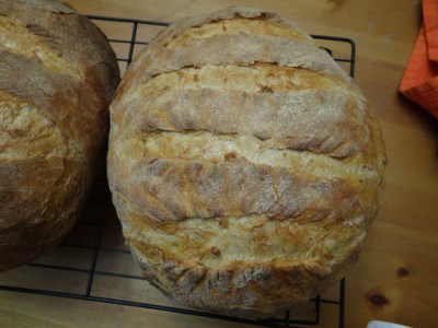 Woohoo! I’m finally done with this challenge! I cut the hydration down from 78% to 71%, and it did seem to work better this time as far as handling and shaping the loaves. I thought my parents had a dutch oven so I didn’t bring one over to their house and ended up having to use a baking sheet and pyrex dish to bake these. They ended up a little flat but otherwise perfect.