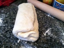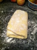 6. After the last fold, roll the rectangle out to about 3/4″. If it is difficult, put dough in the fridge for a bit to relax the gluten. If using immediately, cover, rest in fridge for about 30 minutes, then use as needed. If it’s for later, cut into sections big enough but that still fit easily in your freezer (usually just in half), layer with wax paper between sections, freezer bag it, & store until needed.