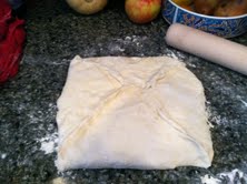 1. Pull the corners of the cuts out of the dough ball to make a square shape. Roll the dough out to a square slightly thicker in the center than on the sides, and slightly larger than the butter block.