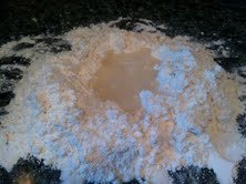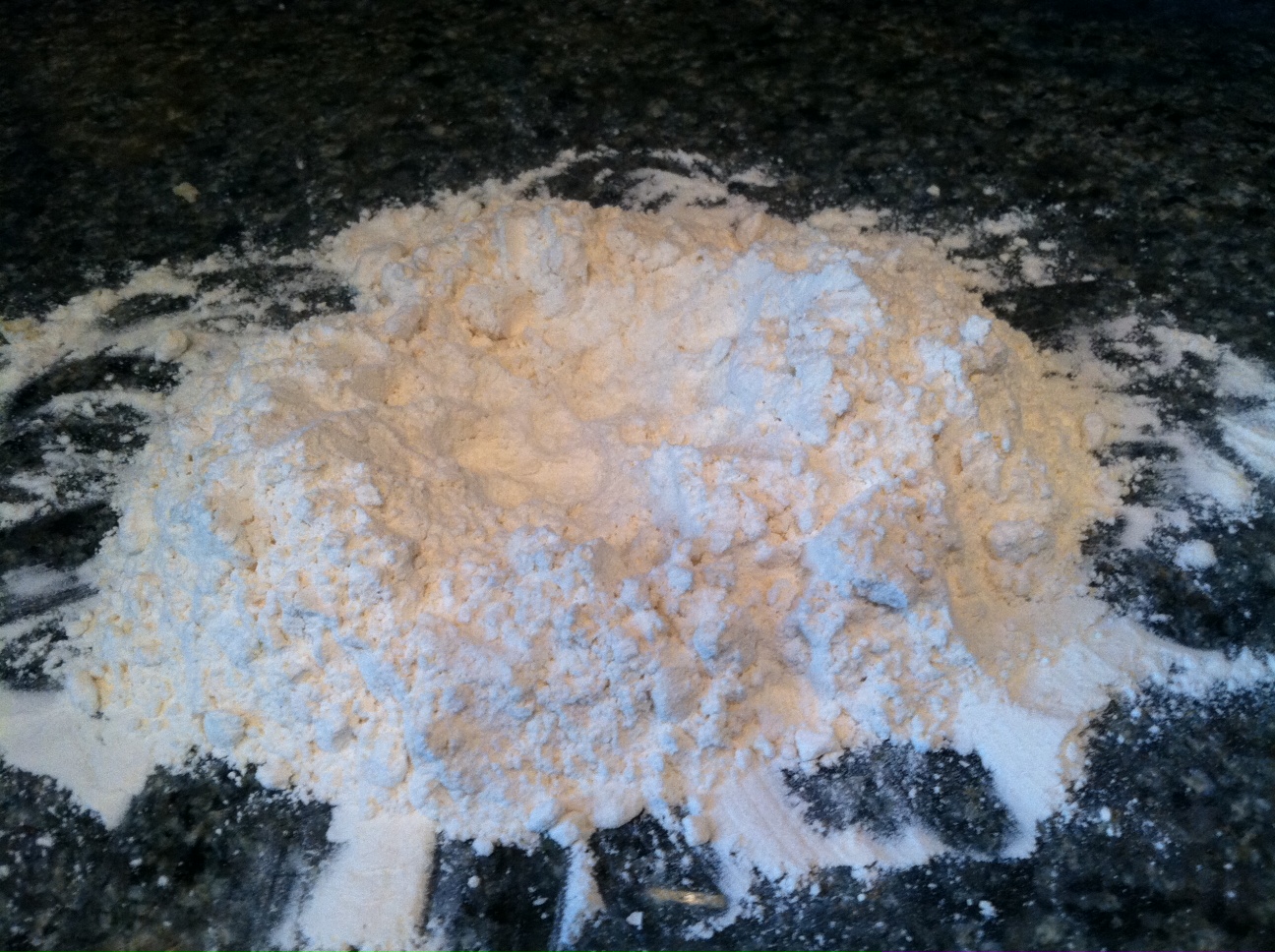 1. Sift flour onto your work surface. Cut the butter into the flour until it looks like course crumbs.