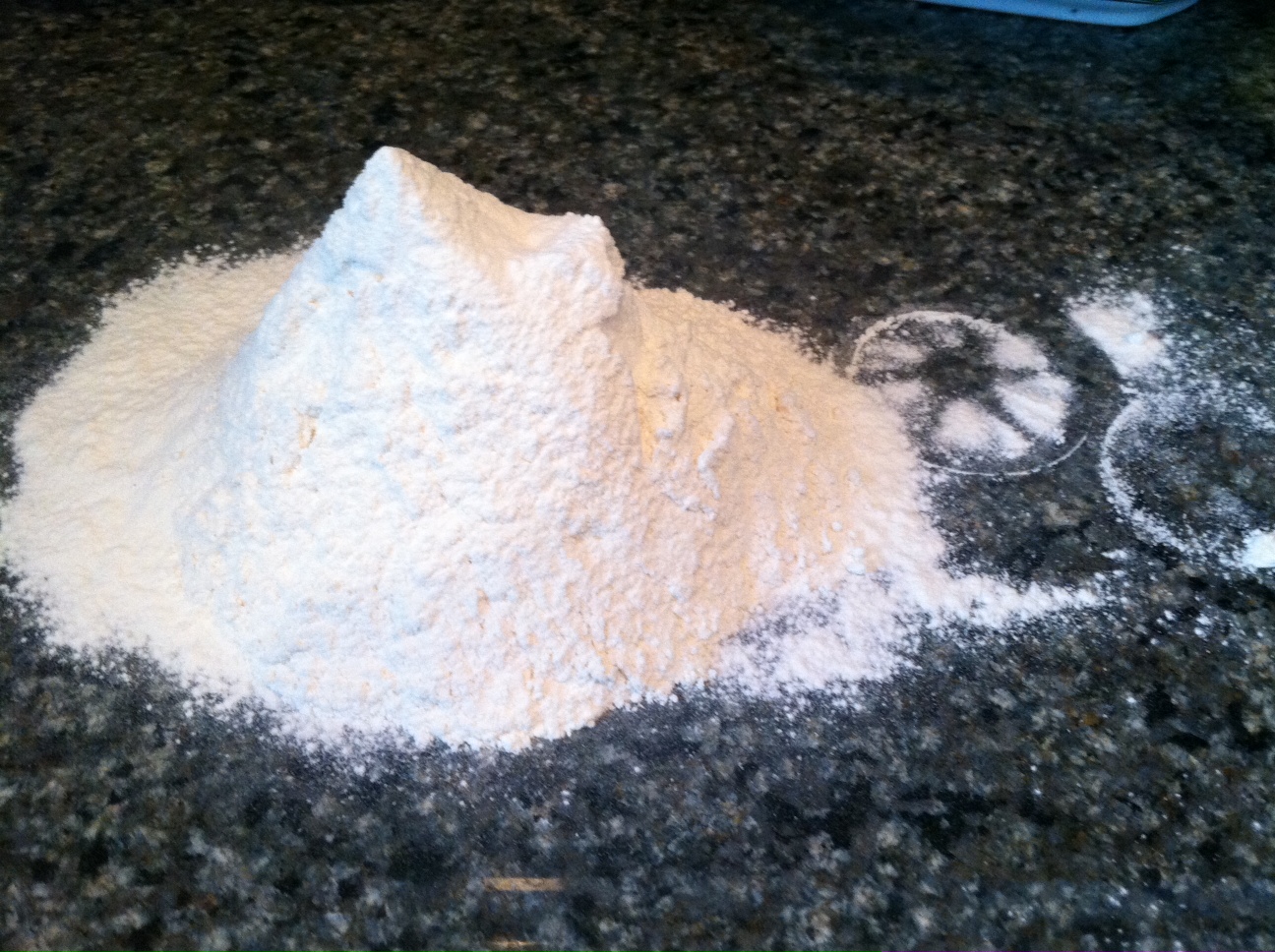 2. Now it’s kind of like making fresh pasta. Shape into a mound, then make a well in the center of the mound. Add the salt & cold water into the well, then with a fork, use a whisking motion to gradually incorporate the well’s sides into the water.