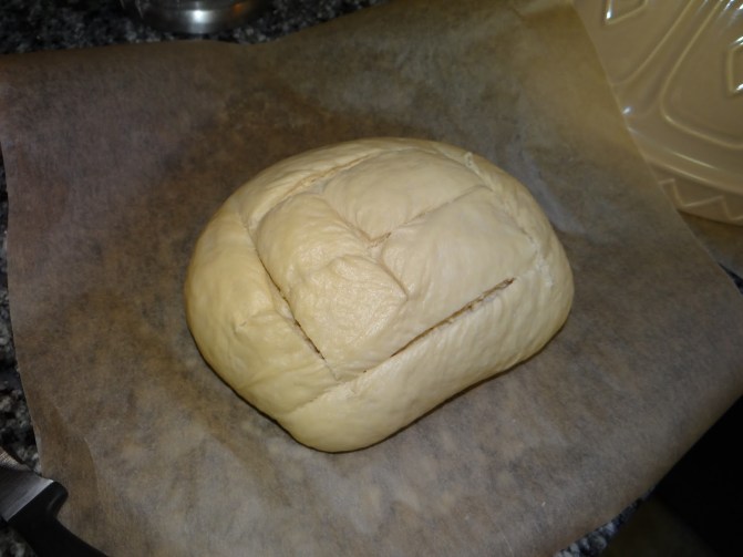 6. After about an hour rise, preheat the oven to 350 degrees F. Score the boules in a pretty pattern or score the sandwich loaves with one long line down the middle.