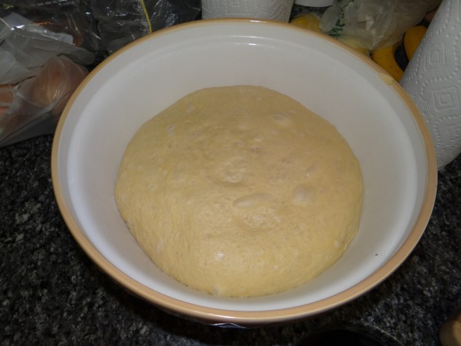 Mix all the ingredients together, kneading well so it is entirely incorporated. Place it in a bowl, covered, to rise for 1.5 hours.